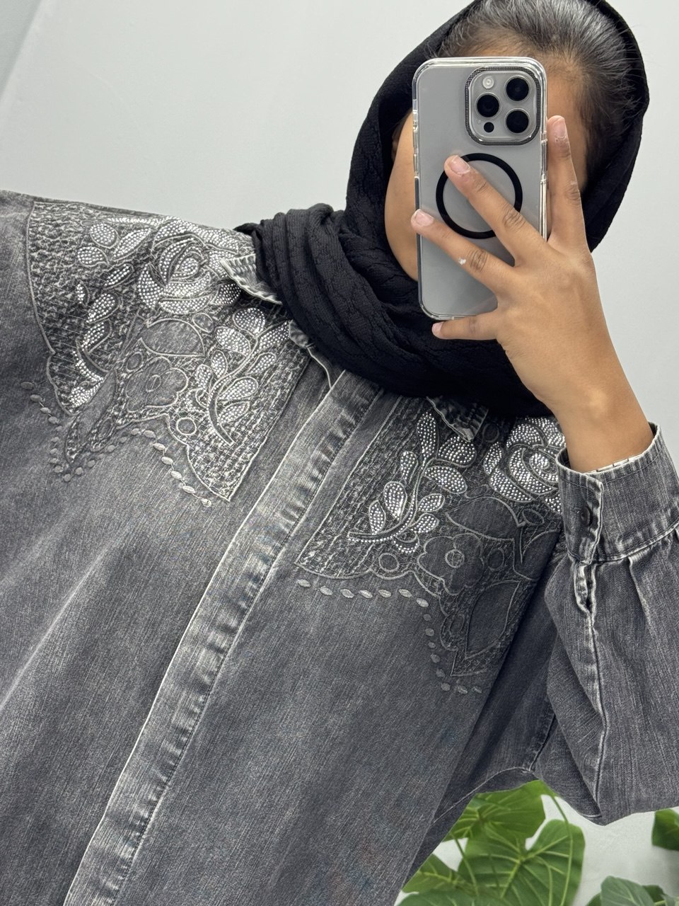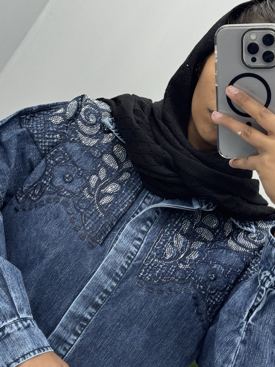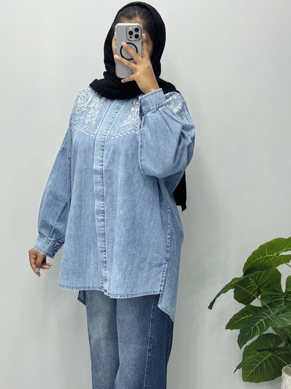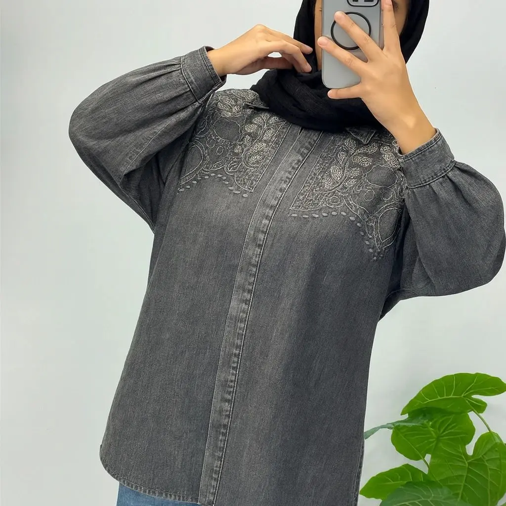 مانتو جین گلدوزی شده با کیفیت بالا شسته شده و آنزیم شور شده تک سایز لانگ سایز 42 الی 50 قد جلوی لباس 77 قد پشت لباس 85