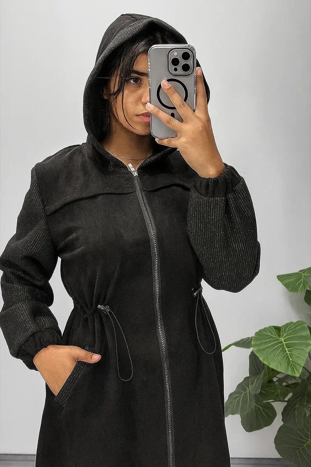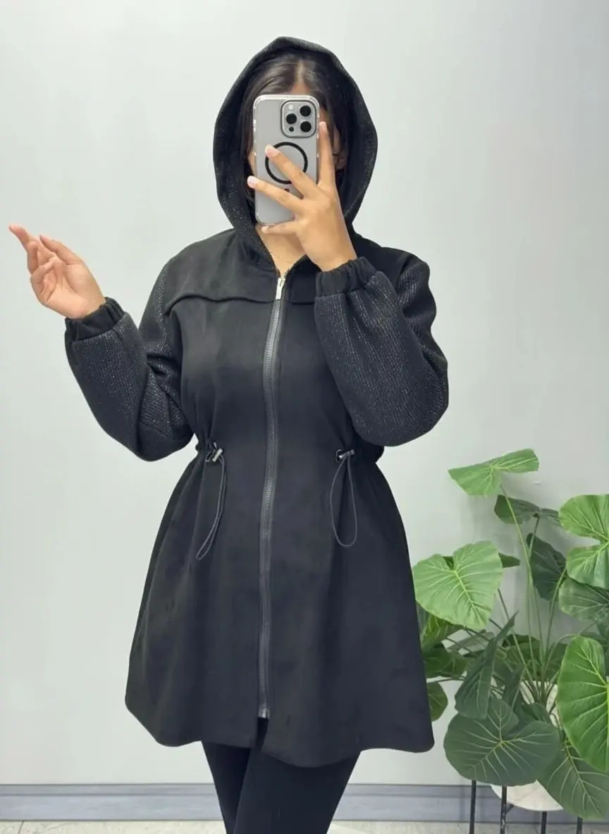 مانتو پاییزه با پارچه سوئیت و آستین کار فوتر لمه دار