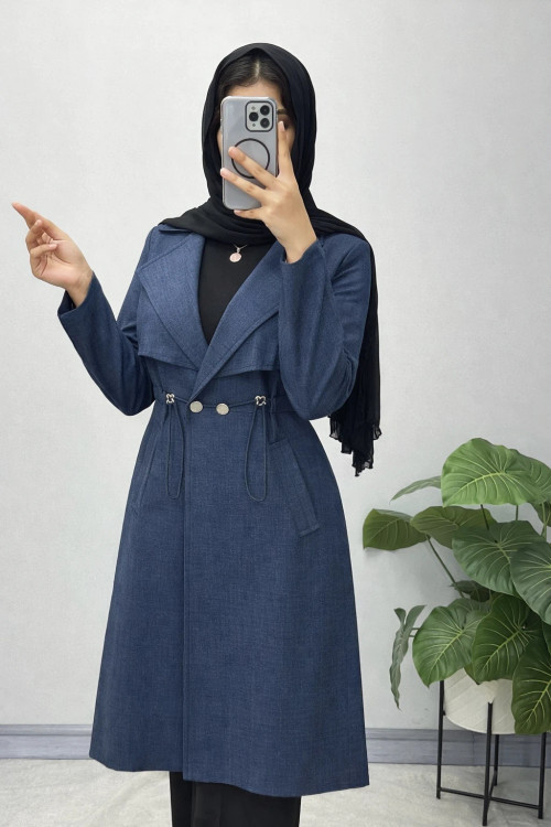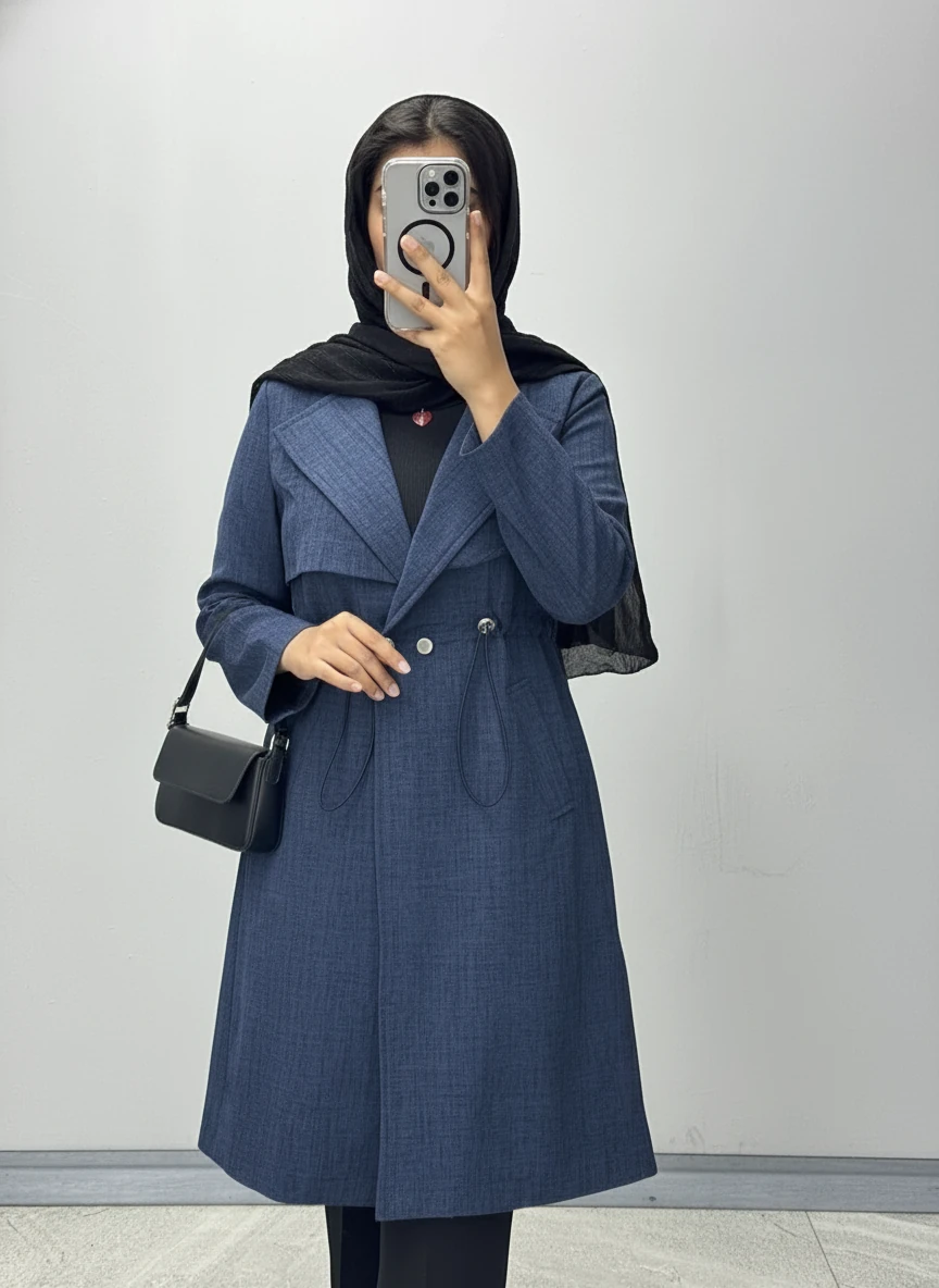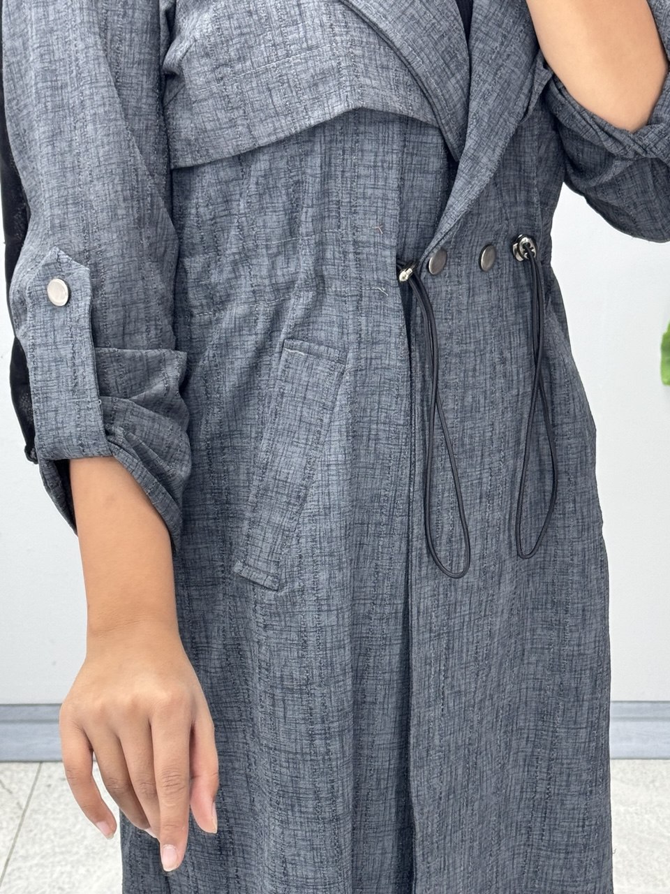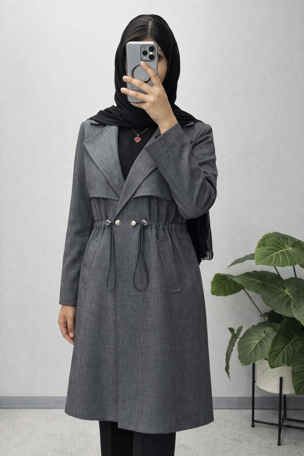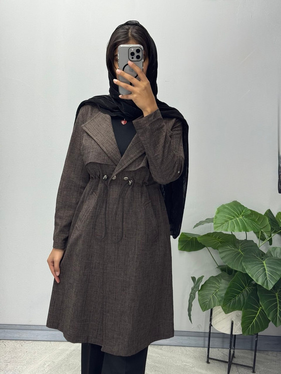 کمر کار گت کار شده برای تنظیم سایز آستین کار بند تنظیم داره و نحوه بسته شدن مانتو با دکمه فشاری فقط در کمر کار داره و همگرد