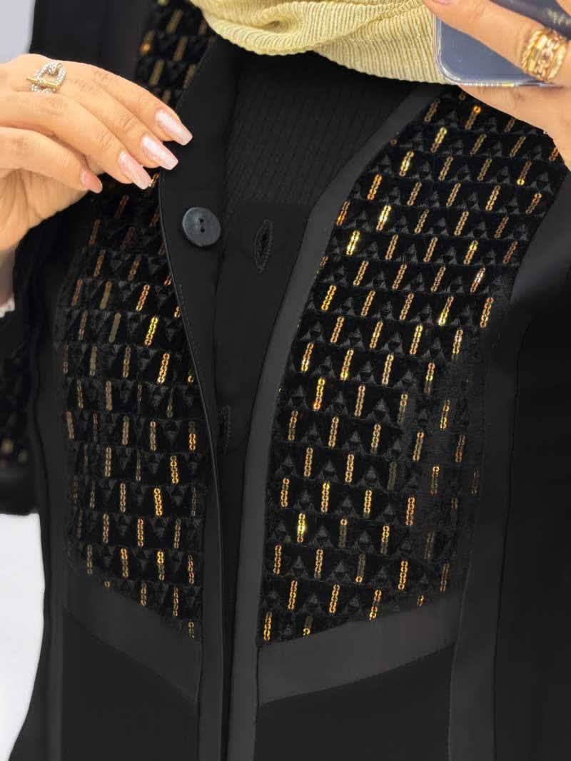 مانتو مجلسی حریر اسود خرجکار مخمل پولکی
