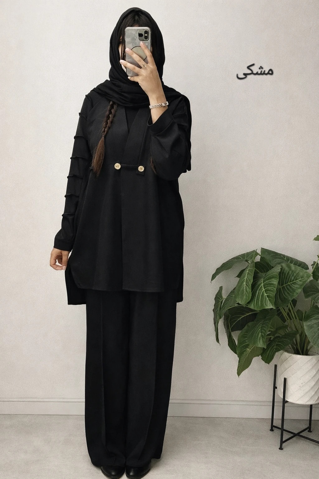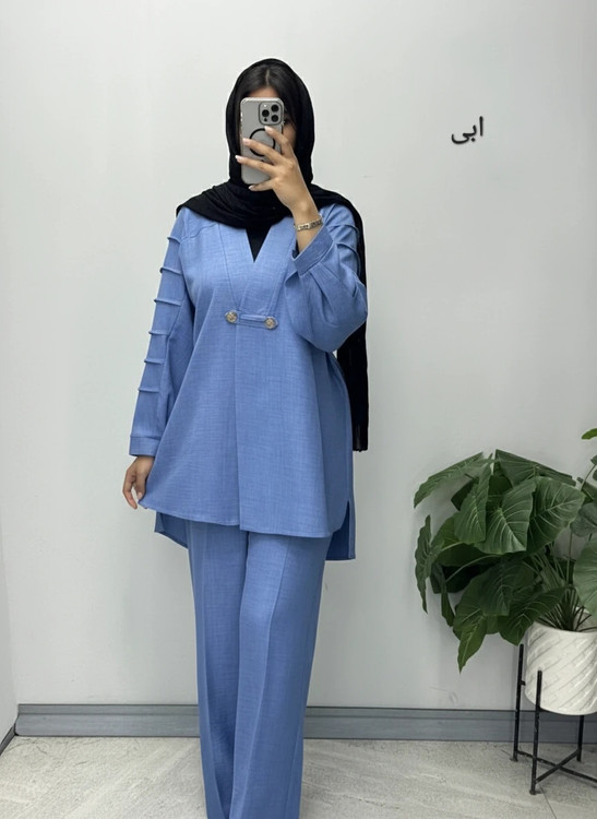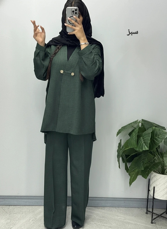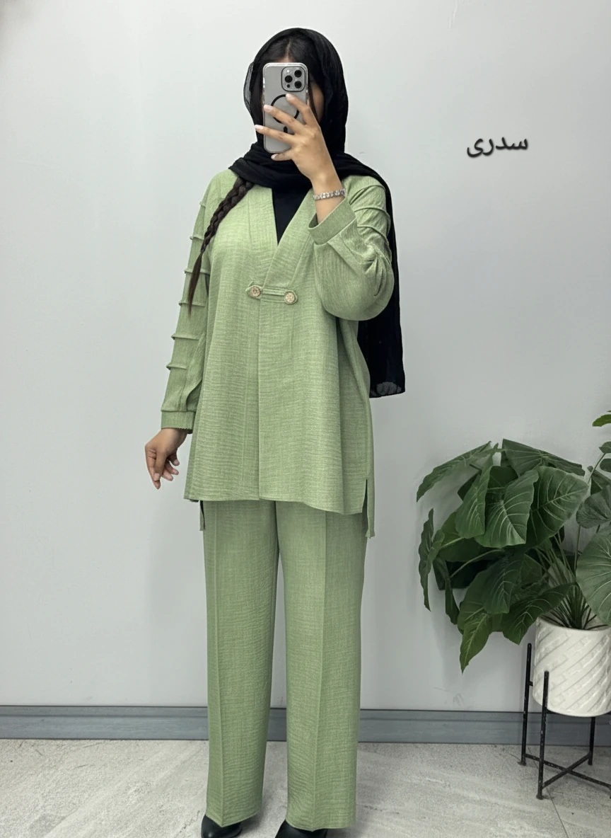 3 سایزی مناسب برای سایزهای 42 الی 54 قد مانتو پیش 80 پشت 85 قد شلوار 108فاق 33
