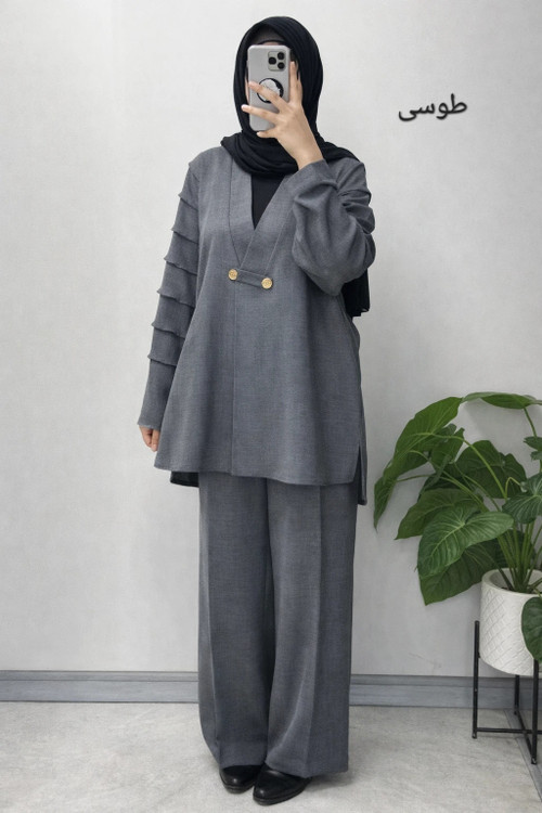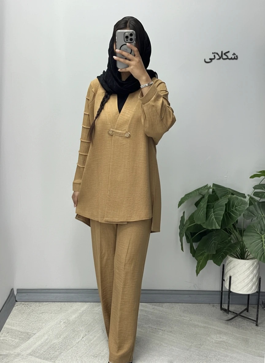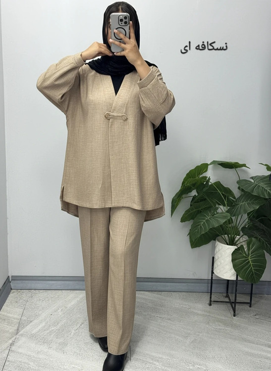 ست سایز ویژه با پارچه شانتون پشت شلوار کمر کش و مدل مانتو بهبود صورت پانچ