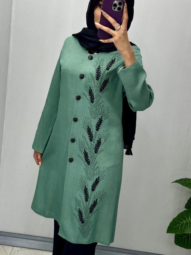۶ سایزی مناسب برای سایزهای ۴۶ الی ۵۶ قد مانتو ۱۰۳ قد آستین ۵۹