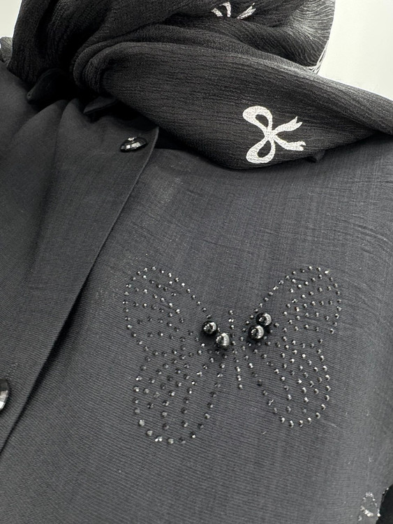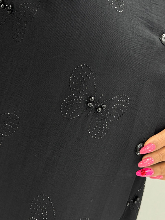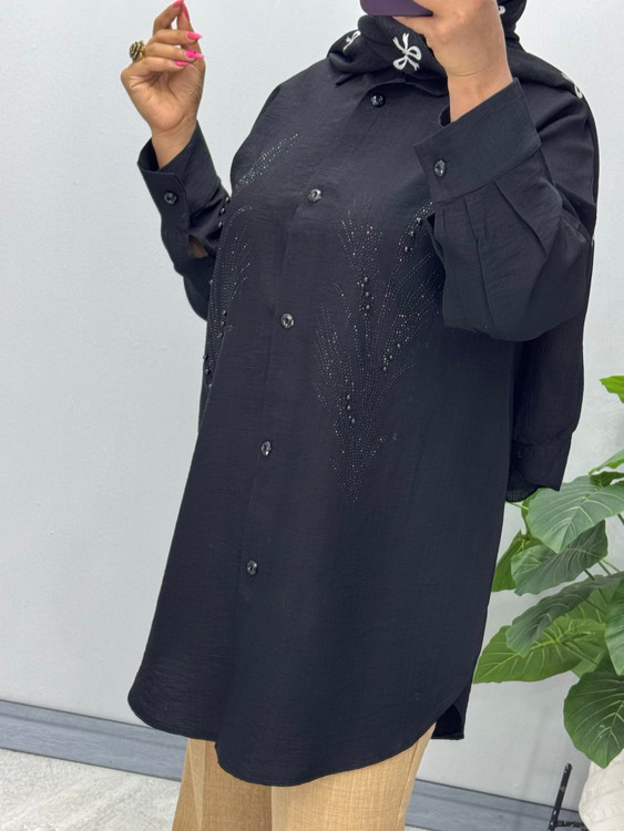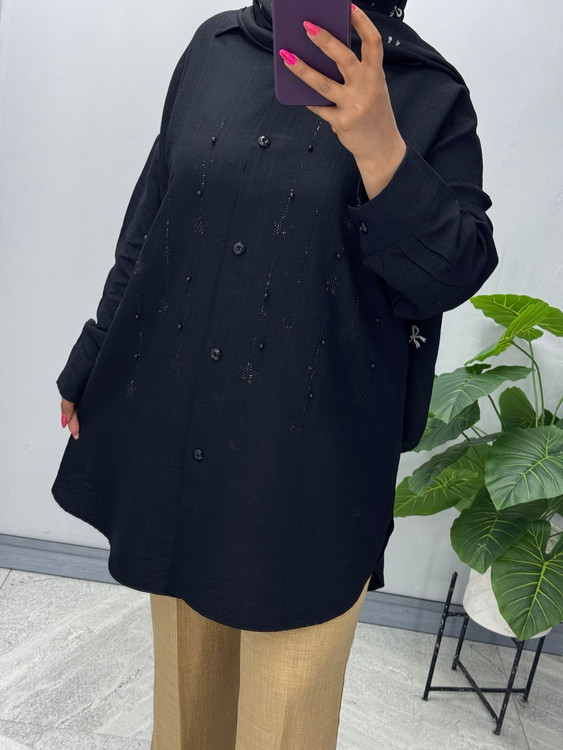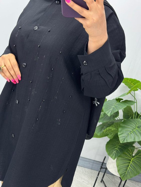 شومیز مانتویی با پارچه بابوس دو نخ مناسب تابستان و تک رنگ مشکی با نگین کاری و مروارید پارچه بابوس خیلی سبک و راحته